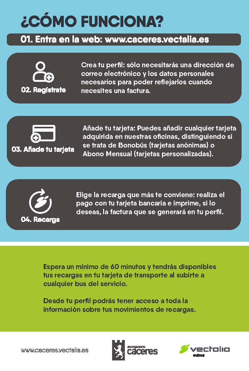 Desde el próximo 27 de julio los usuarios del transporte urbano de Cáceres podrán recargar online sus tarjetas de transporte a través de esta web siguiendo unos simples pasos, tanto para el bono bus como para el abono mensual.